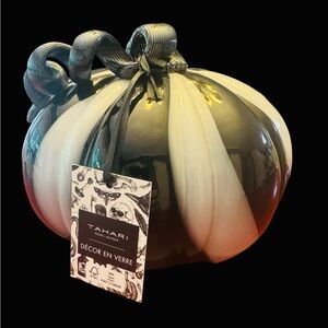 Stylish glass pumpkin with black and white stripes. Ideal for modern decor. Set of 2 NWT 6” high larger pumpkin is 6” round smaller pumpkin is 5” round