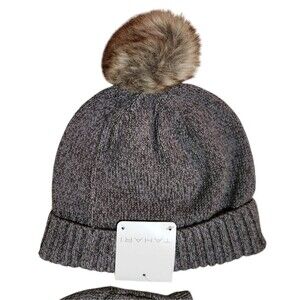 Tahari Sweater Hat Set Girls L Gray Cotton Blend Knit Red Heart Faux Fur Pom