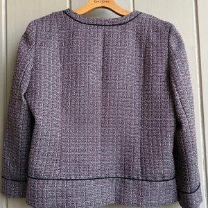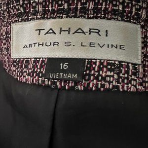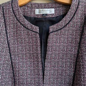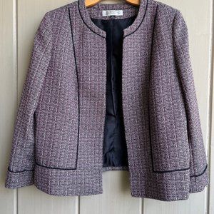 Tweed open front blazer, size 16. Can be worn open or closed with 3 hook and eye closure. Beautiful cranberry, black, and white tweed. Black cord detailing.