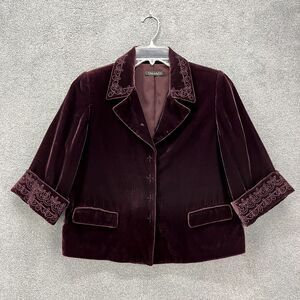 Tahari Velvet Blazer Jacket Womens 8 Purple Embroidered snap button peplum