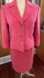 Two-piece skirt suit in a bright pink color. The suit consists of a blazer-style jacket