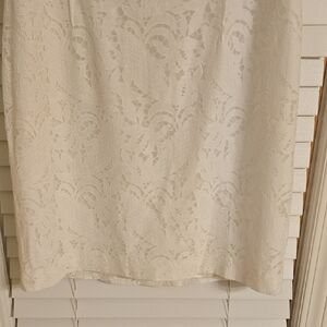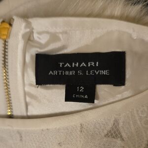 This chic white mini dress by Tahari is perfect for a bride or wedding guest, featuring a sleeveless design and a classic bateau neckline. The sheath silhouette offers a timeless elegance, crafted from a textured fabric that adds a touch of luxury to its streamlined look. Clean and ready to wear.