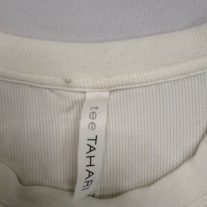 This Tahari tank top features a classic white color and a stylish curved hem that adds a touch of elegance to its design. Made from a textured fabric, it offers a comfortable fit and a versatile look suitable for casual outings or as a layering piece. The large armholes and high rounded neckline provide ease of movement and a modern silhouette.