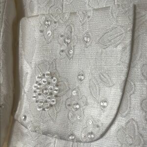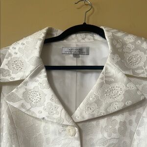 This elegant Tahari blazer in a pristine white color showcases a tailored fit with a chic peplum detail. Made from a textured fabric with a subtle sheen, it is perfect for formal occasions. The three-quarter length sleeves add a contemporary flair to this sophisticated piece.