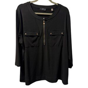 Tahari Woman Black 3/4 Sleeve Zip Front Top Sz 2X blouse