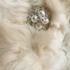 Tahari's faux fur cape or wrap beautifully mimics a sumptuous fur enhanced by a pearl and rhinestone brooch. Body warming perfect for weddings, parties, or any special occasion when luxurious outerwear is needed.