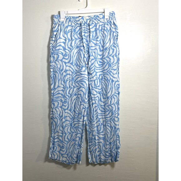 Tahari Women's 100% Linen Blue White Cropped Pants Wide Leg Geometric Sz Medium