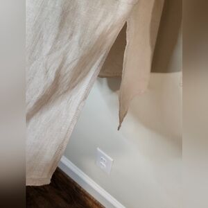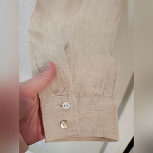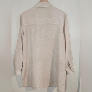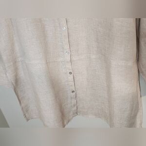 100% linen, button down with collar, oversized tunic, shell buttons, extra button on material tag, roll tab sleeves, split hem