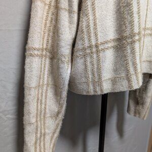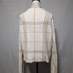Tahari neutral beige and cream soft knit textured plaid sweater. Relaxed fit with dropped shoulders and a subtle mock neckline. This sweater sits at the waistline, giving it a slightly cropped style. Perfect for fall and winter seasons.