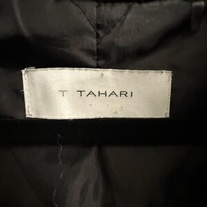 Tahari Black water resistant nylon coat with hood and full zipper and cinched waist, light quilting, draw string coat. Perfect for cooler winter or fall. #trenchcoat