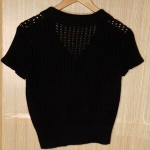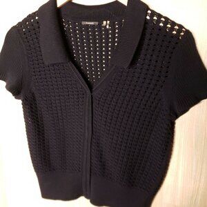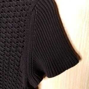 Tahari women’s black short sleeve open knit cardigan small. Gently used condition. Measurements are: 22 ½" from shoulder to hem, and 18 ½" from armpit to amrpit.