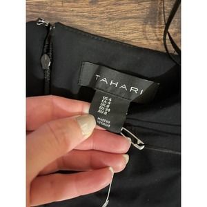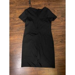 Tahari women’s black dress round neck short sleeve zippered sheath dress size 4. Fabric has stretch.