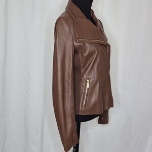 Tahari Women's Brown Lambskin Leather and Knit Zip-Front Cropped Jacket - Size M