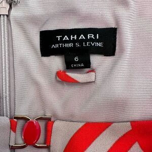 Step out in style with this beautiful Arthur S. Levine Women's Geometric Print dress from Tahari. Its bold orange and white color scheme is eye-catching, sure to make you stand out in any crowd. The dress features unique 3/4 wide sleeves, adding a touch of modern sophistication to a classic shift silhouette. Perfect for anything from a day at the office to a weekend brunch, this versatile dress is a Size 6. Trust Tahari to deliver not just style, but also quality and comfort.