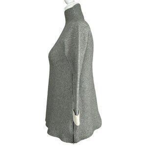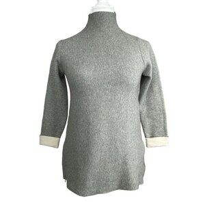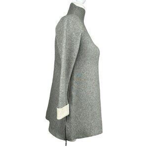 Tahari women’s sweater XS, it has gray with cream color-block 3/4 cuffed sleeves, mock neckline, stretchy, very soft thick fabric and accent zip side hems. Materials 48% viscose, 31% polyester, 21% nylon. Care machine wash cool lay flat to dry. Condition is preloved very good as shown in pictures. Please preview the measurements to ensure fit.