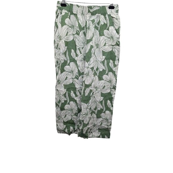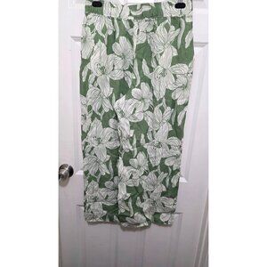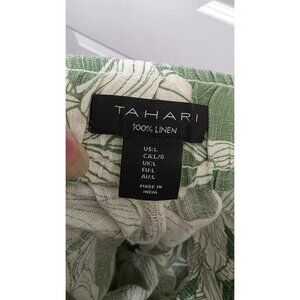 Tahari Women's Green & White Floral Print 100% Linen Pants Size L Elastic Waistb