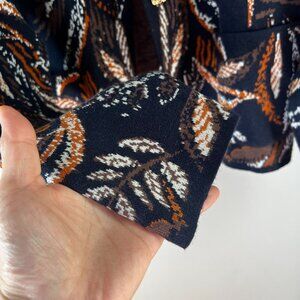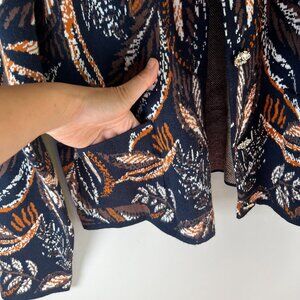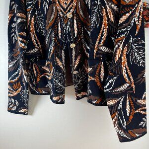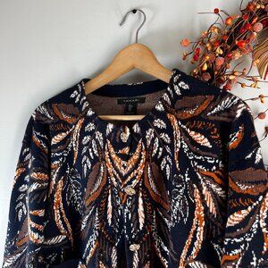 Tahari Womens Knit Cardigan Sweater SMALL Brown Leaf Print Black Rayon Blend