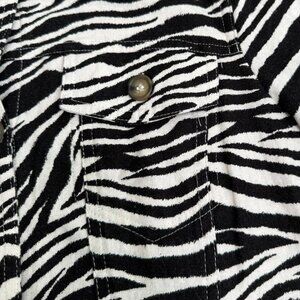 Women's size M. Brand is Tahari. This is a button up, zebra print jacket. Lightweight, made with a linen blend. Cropped style. One small pocket on the chest at each side. Buttons at cuff and is collared. Excellent pre-owned condition with no flaws noted. Please see all photos for details and measurements. Take a look and make me an offer!