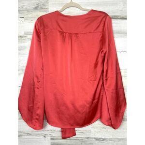 Tahari Women’s M Pink Silky V-Neck Tie Knot Long Sleeve Flare Blouse Top NEW