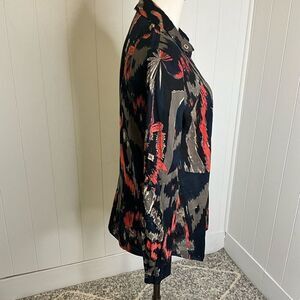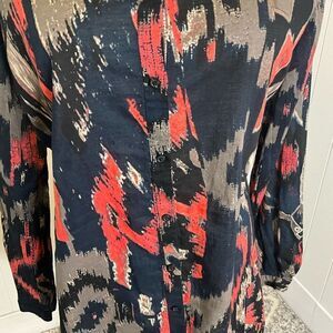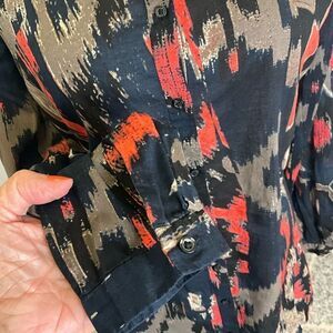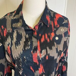 Tahari Womens Medium Button Front Shirt Black Red Geo Print Long Sleeves Cotton
