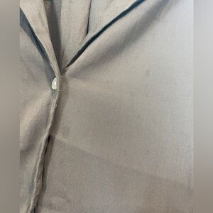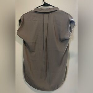Effortlessly chic staple with a relaxed, drapey fit. It features short sleeves, a soft collar with an open neckline, and a full button front. The lightweight fabric gives it a fluid, comfortable feel—perfect for both office wear and casual looks. The color is a neutral taupe-gray that pairs beautifully with jeans, trousers, or skirts