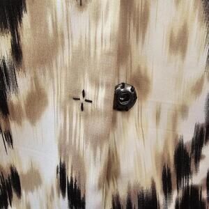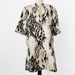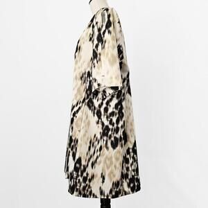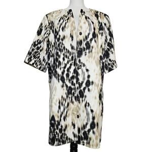 Stylish short sleeve long blazer jacket featuring an abstract black and beige print pattern.