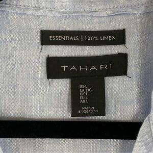 Chic sky blue linen top by Tahari. Perfect lightweight top for all seasons! Also works as a cover up! Very good preowned condition. No holes or stains. Color may vary slightly due to lighting. Please review photos closely for verification of condition and measurements. Please ask any questions before purchasing. Comes from a smoke free, pet free / but pet friendly home. If you have allergies, please ask.