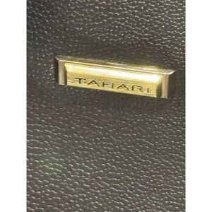 Has the signature Tahari logo, making it suitable for casual occasions. The interior is clean, but there is exterior scuffing visible in the photos. Keywords: Tahari, tote, vegan leather, Stardust Gray, women's bag, gold hardware, casual tote, zipper closure, double handles, pre-owned.