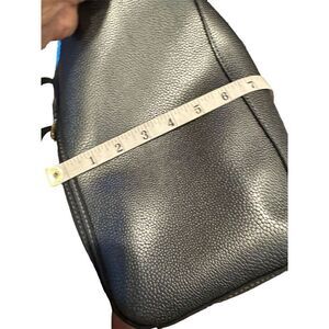 The Tahari tote is crafted from vegan faux pebble leather in a Stardust Gray color. It features a spacious main compartment with a secure zipper closure and durable double straps. The tote is