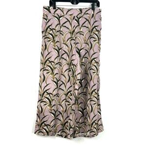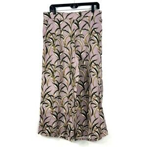 This is a pair of Tahari women's wide-leg cropped pants in size L, made of 100% linen in a purple color. The pants feature an elastic waist for easy pull-on wear, with a high rise and a 24-inch inseam. The floral pattern adds a touch of romance and tropical flair, making these pants ideal for occasions like travel, parties, or casual outings during the summer, fall, or spring seasons. Perfect for a vacation or cruise, these flowy and comfortable pants offer a stylish and relaxed look.