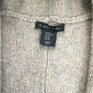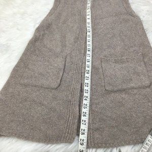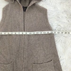 Tahari women’s XS cardigan, it has a open front, pockets, hooded, long hip length, soft thick fabric and sleeveless. Materials 39% acrylic, 31% nylon, 27% wool, 3% spandex. Care hand wash cold lay flat to dry or dry clean. Condition is preloved very good. Please preview measurements to ensure fit.