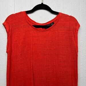 Tahari women's linen top in red-orange. Round neck. Short sleeves. Buttoned in back with slit. Lightweight and breathable. Natural fabric. In good used condition. No stains, tears or holes.
