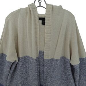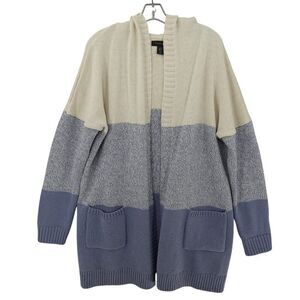 This Tahari XL women's cardigan features a bold blue and cream colorblock with a hooded open-front design, offering comfort and style. It's made of a soft, lightweight blend fabric perfect for layering.