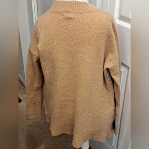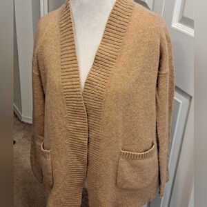 very good condition, camel brown, ribbed shawl collar, pockets & hemline, 7" cable knit cuffs, pit to pit 22" sleeve 17.5" length 25"