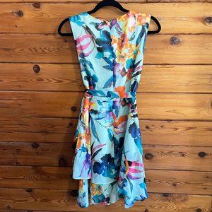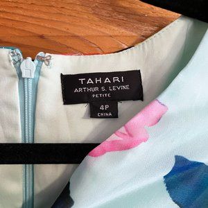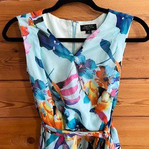 Tahari asl Blue Floral Chiffon Dress Ruffles Sleeveless SIZE 4P belted