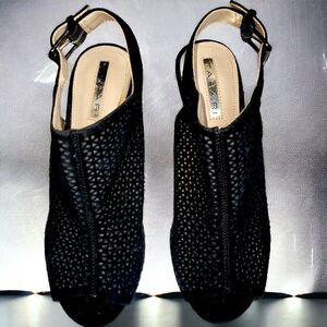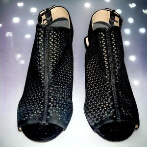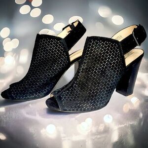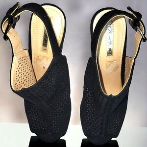 Features: pee-a-boo cut-outs, suede material with wide slingback straps, thick heels