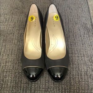 Black sporty heels with leather toe and gold stitching. Worn only around the house. Never worn outside. Comes from a smoke free home.