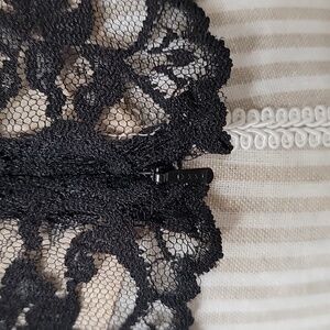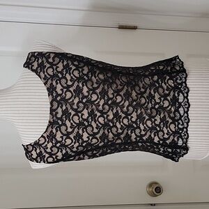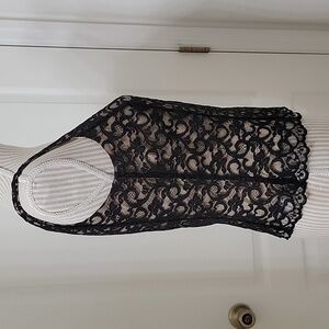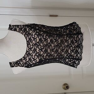 Tahari by Arthur S. Levine, Black Lace over Creamy Tan Sleeveless Top, Size 6, EUC. No Holes, Rips, Stains or Snags. Gorgeous Black Lace over Creamy Tan / Nude Lining. Side Zipper Closure. So very versatile....pair with jeans for a casual outing, with trousers or a skirt for the office or dinner party, options are endless. Please refer to measurements in photos to ensure proper fit. Shown on a size 6 mannequin.