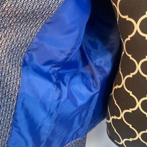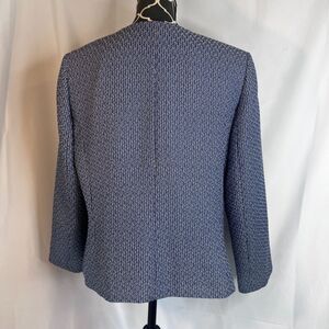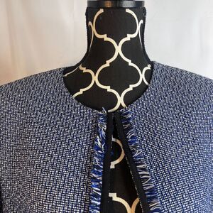 Tahari by Arthur S Levine Blue White Tweed Fringe Trim Open Front Blazer Sz 14