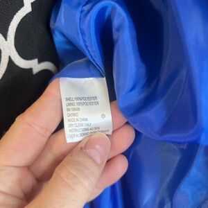 Open front, long sleeve, lined, fringe trim down front, front pockets, hook and eye at top, padded shoulders