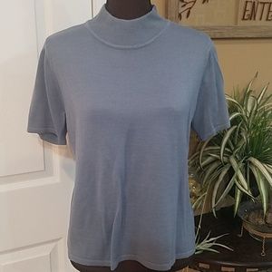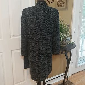 This is an excellent outfit. EUC. The shirt is 70% acrylic 30% wool. Pants are 100% polyester. The shell of the coat is 90% acrylic 10% polyester, lining is 100% polyester. The coat has the same kind of color blue in it as the shirt.