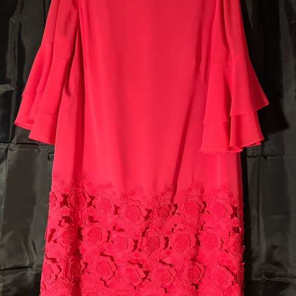 Bright pink Tahari dress size 10 cut out lace at hem, 3/4 ruffle sleeve bateau neck lined 33" length great condition