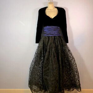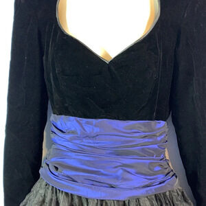 Tahari formal ball gown black velvet bodice blue Prom evening tulle skirt size 6