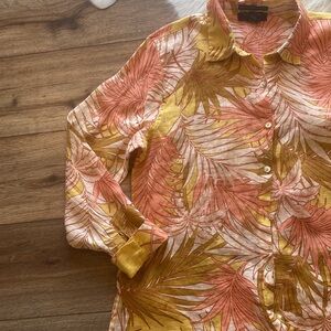 Tahari women's button-up shirt made of linen, featuring a tropical print with orange, pink, and yellow hues. The shirt has long sleeves and a classic collar. Linen is a textile made from flax plant fibers, known for its strength, absorbency, and quick-drying properties, making it comfortable in hot weather. Linen clothing is versatile and can be dressed up or down, suitable for both casual and more polished looks. Open to offers and bundle items to save!