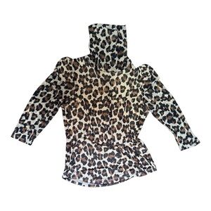 Classic Tahari leopard print turtleneck top. Lightweight opaque mesh. Scrunchie elongated neck. Charming gathered "leg of mutton" 3/4 sleeves. Great for layering under a suit, or just tucking into a pair of high waisted pants. Beautiful condition.