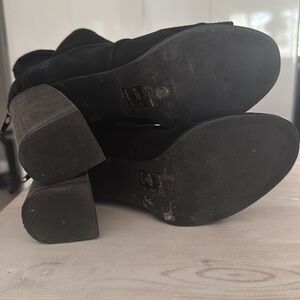Open toe suede booties with back zip closure. 3.5” chunk heel.