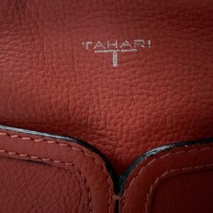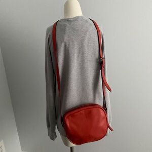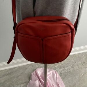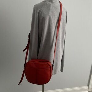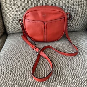 Medium size crossbody with long adjustable strap.The color is a subdued orange/tangerine.Very good condition.No wear to strap or bag. Leather.Pocket in front with snap.Zipper close with leather tassel.Zipper pocket inside.Pewter color embellishments.No scuffs.9/8 in.Lots of room inside.Fast ship!