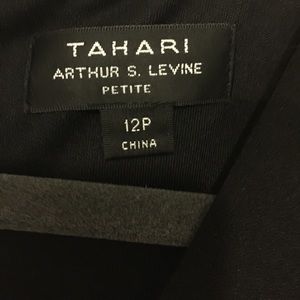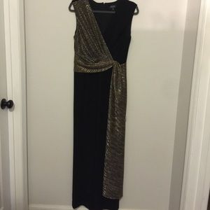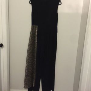 Worn once - Tahari pantsuit black with gold and silver attached draped fabric. Wide leg free flowing bottom form fitting top. Extremely flattering and comfortable.