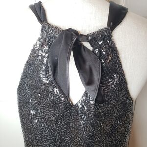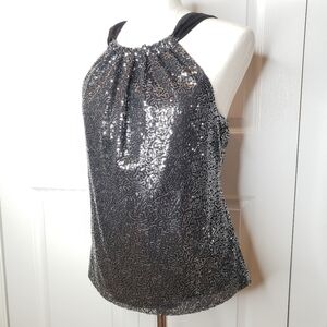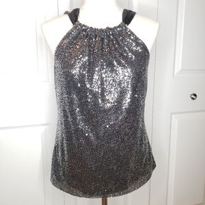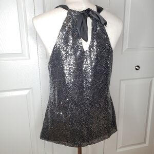 Tahari silvertone sequined top size S. Black ribbon straps tie in the back. Fully lined. Beautiful top, perfect for the holidays or NYE. I only wore it once for a NYE party.