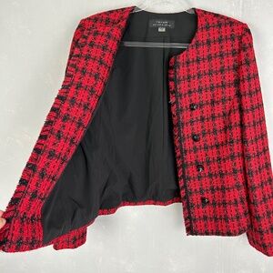 Tahari size 12 tweed jacket black plaid collarless preppy academia open front